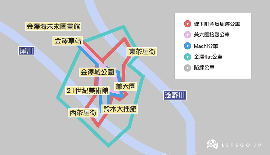 | 城下町周游公车 | 兼六园接驳公车 | Machi公车 | 金泽flat公车 | 路线公车 | |