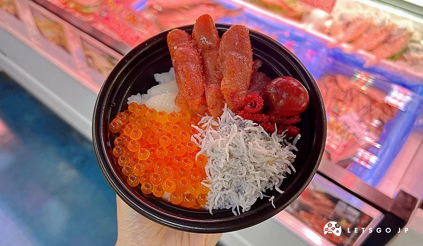 「日本海鱼市场」的特色是可实际看到烤鲭鱼、削昆布等制作贩售,而且许多店家还提供免费试吃。市场内有推出自制海鲜丼(福ふく丼)的活动,先在服务台或是「杂鱼屋」土产店购买2,000日元的10格票券,即可凭券到指定店家兑换喜欢的食材与商品,很像参加园游会一样有趣。市场内提供多处内用空间,可以坐着慢慢品尝自制海鲜也顺便品尝购买到的战利品。