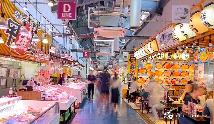 日本海侧最大规模的「日本海鱼市场」有别于传统市场,里面依照英文字母划分区域,环境整洁好逛,店家从生鲜海产、海鲜干货、茶叶、高汤到各式福井伴手礼跟餐厅,共有50多间,还能使用免税服务,不怕没有时间逛,就怕逛了不想出来。